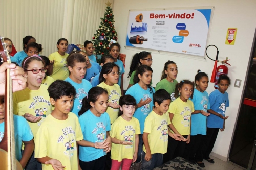 A manhã desta sexta-feira, 12, teve um brilho especial na Imepel, quando a empresa recebeu a visita do coral do Bairro da Juventude. Com músicas natalinas, as crianças alegraram e emocionaram os colaboradores. A visita do coral do Bairro da Juventude à Imepel é uma das ações realizadas pela instituição beneficente junto às empresas parceiras.