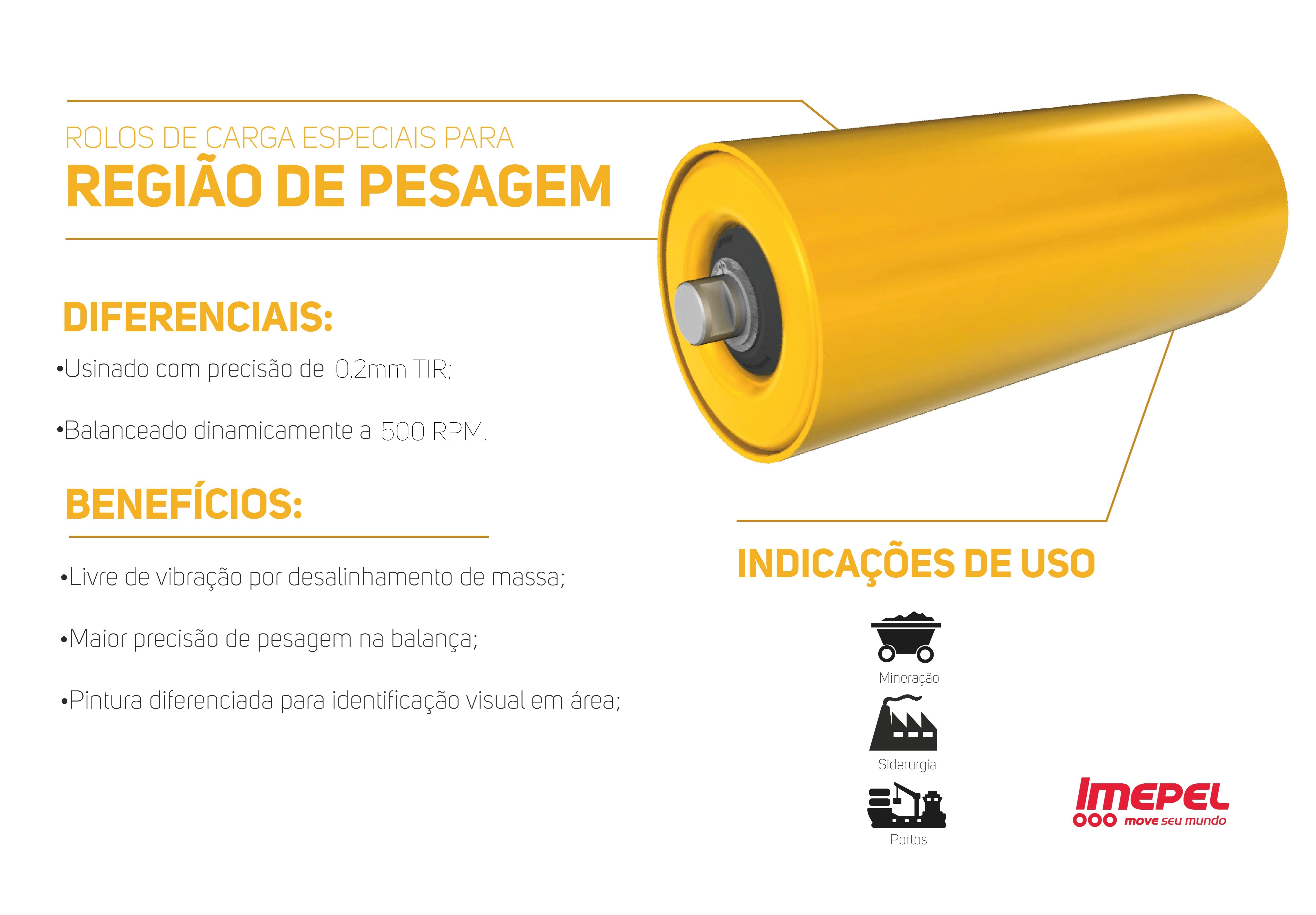O Rolo de Balança IMEPEL é similar ao Rolo de Carga, porém é indicado para aplicação exclusiva na região de pesagem (balança). Ele passa por um processo de usinagem no tubo com o objetivo de alcançar uma excentricidade máxima de 0,2 mm, além de receber balanceamento dinâmico a 500 RPM para reduzir a vibração por desalinhamento de massa. Nunca deve ser aplicado individualmente e recomenda-se a substituição completa de todos os Rolos da Balança para prevenir ineficiência de pesagem.