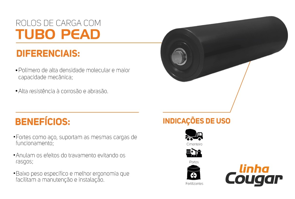 O Rolo é fabricado em polímero de alta densidade molecular, feito para garantir resistência, ergonomia e durabilidade nos ambientes mais agressivos. O rolamento pode ser aplicado diretamente no tubo ou com uso de flanges UP com sistema de aletas que proporcionam segurança para a correia em caso de travamento do rolo.