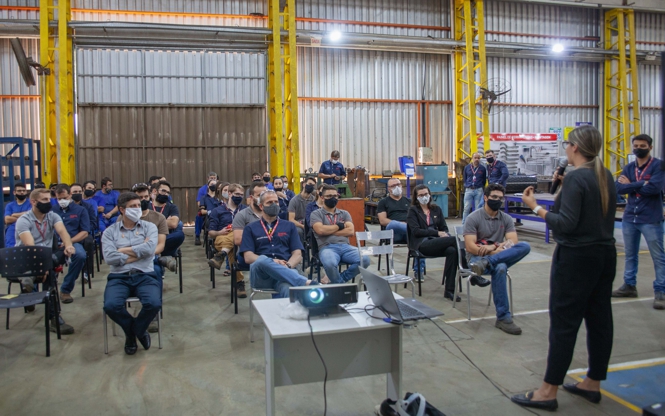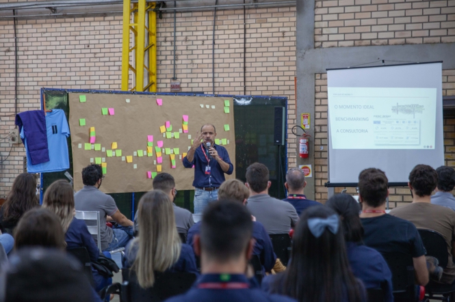 Gerente Industrial Júlio Cota comenta acerca do Lean Manufacturing para os colaboradores. Foto: Imepel
