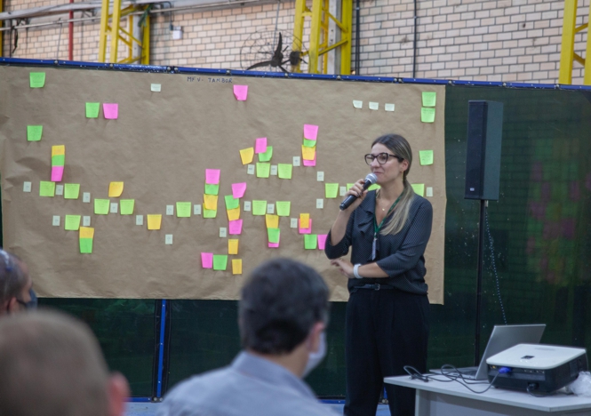 Colaboradores do setor de Métodos e Processos apresentando os resultados do programa Lean Manufacturing. Foto: Imepel