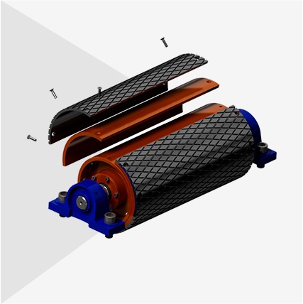 Las poleas con revestimiento extraíble están diseñados para facilitar el mantenimiento y agilizar la sustitución del revestimiento aplicado a las poleas accionadas o impulsadas. Esta polea recibe placas de acero moldeadas y recubiertas de caucho vulcanizado que se fijan en su propio cuerpo. Esto permite cambiar el revestimiento sin tener que retirar la polea del transportador, lo que reduce considerablemente el tiempo de inactividad.